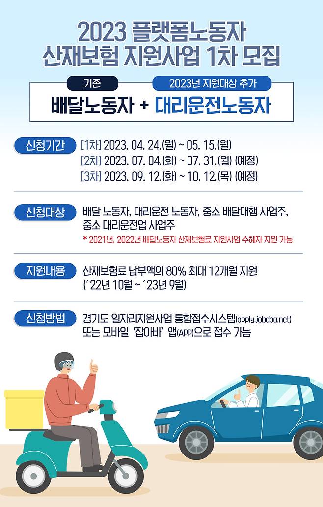 대리운전 노동자 대리운전 업무에 종사하고 있는 자.대리운전 역시 주소지를 경기도에 두거나 관내 대리운전 업무를 수행하고 있는 사업장의 사업주라면 지원받을 수 있습니다.※특수형태근로종사자로 산재보험에 가입된 근로자와 그를 고용하고 있는 사업주만 지원 가능합니다.※사업장관리번호 기준 최대 30명까지 결제 가능합니다. 3. 지원 내용배달과 대리운전 최대 지원금액에 차이가 있습니다.배달노동자 및 배달업 사업주 ’22년 10월~23년 6월 11,510원x 산재보험료 납부개월수 23년 7월~23년 9월 5,530원x 산재보험료 납부개월 대리운전노동자 및 대리운전법 사업주 22년 10월~23년 6월 11,070원x 납부개월수 23년 6월~23년 9월 5,750원x 납부개월수위 금액에 따라 지원하며, 그 금액은 최대 지원금액입니다. 많은 금액은 아니지만 지원 대상에 해당하는 경우 꼭 신청해 주시면 감사하겠습니다.정책에 대한 호응도가 높고 국민 참여가 많을수록 좋은 정책이 많이 나옵니다. 꼭 기억해주세요. 4. 신청 및 절차잡아보세요.어플라이에서 온라인 신청만 가능합니다.사업주가 신청할 경우 지원대상 배달노동자별 증빙서류를 수집해 이메일만으로 신청이 가능합니다.증빙서류는 산재보험 가입과 근로를 하고 있다는 내용서입니다.마무리말 배달노동자와 대리운전 노동자는 플랫폼 노동자로 경기도일자리재단이 지원하는 제도입니다.1차 모집기간: 2023년 04월 24일 ~ 2023년 05월 152차 모집: 2023년 07월 04일 ~ 2023년 07월 31일 (예정) 3차 모집기간: 2023년 09월 12일 ~ 2023년 10월 12일 (예정) 현재는 1차 모집기간이며, 향후 2차 3차 모집도 있습니다. 즉 2022년 10월부터 2023년에 일하는 플랫폼 근로자라면 해당 정책의 지원 대상자에 해당하면 반드시 신청하시기 바랍니다.정부지원사업은 여건이 까다롭다기보다 조건에 해당하는 사람이 몰라서 지원을 못 받는 경우가 꽤 많다고 합니다. 꼭 많은 분들이 지원하셔서 조금이나마 부담이 줄어들었으면 좋겠습니다.이상으로 플랫폼 노동자 산재보험료 지원 정책 배달 대리운전 긴 글을 읽어주셔서 감사합니다.